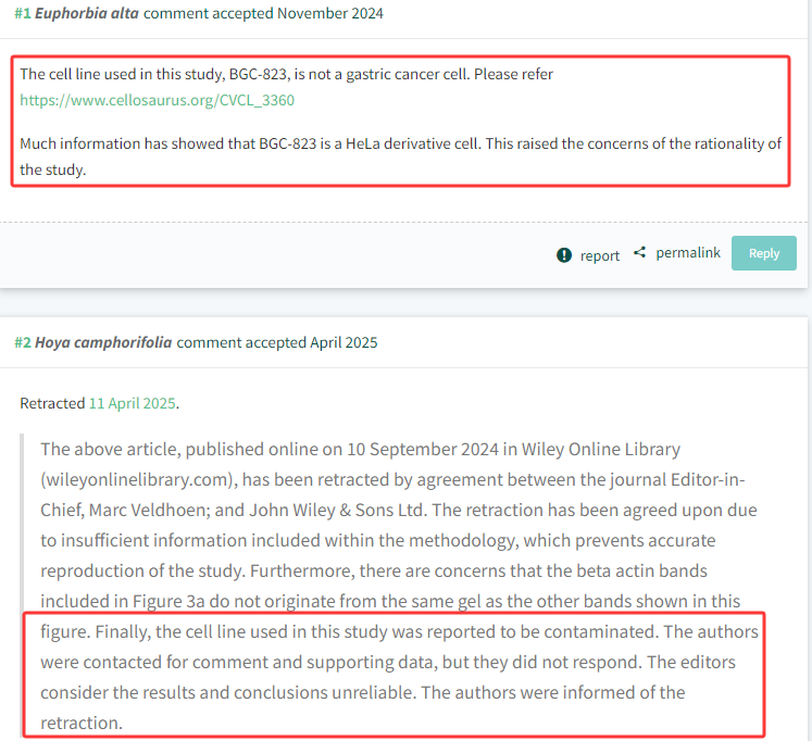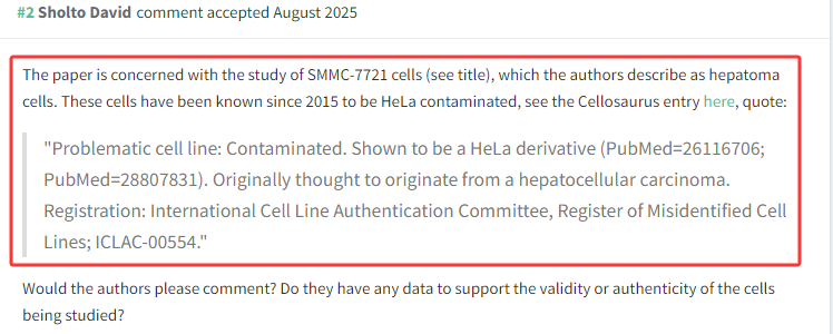 Pubpeer最新出现关于质疑使用问题细胞系的评论!其中涉及到的两篇文章已经被撤稿,另外一篇文章形势也不容乐观!