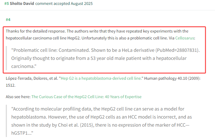 不过,文章作者的回复并未得到Sholto David的认可。Sholto David指出,HepG2虽然是认证无误的,但HepG2属于misclassified cell(具体可参看《HepG2、SK-Hep-1:苏州鉴达细胞鉴定预警系列14》),细胞系在建系之初被错误地认定为肝细胞肝癌细胞系,其本质其实是肝母细胞瘤细胞系。因此,该文章使用的两株细胞系都不属于真正的HCC细胞系。