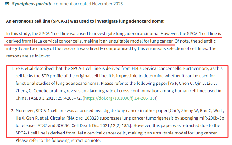 2025年5月,北京某肿瘤医院在Mol Cancer.期刊(IF=33.9)发表一篇文章——《Multi‑omics analysis identifies different molecular subtypes with unique outcomes in early-stage poorly differentiated lung adenocarcinoma》。仅仅半年后(2025年11月),Pubpeer上出现了质疑该文章使用问题细胞系的信息,Synalpheus parfaiti明确指出,作者使用的SPCA-1早已被Hela污染、属于问题细胞系(具体可参看《SPC-A1:苏州鉴达细胞株鉴定预警系列18),不适合作为肺癌细胞模型用于相关研究。Synalpheus parfaiti还列出了两篇文献,一篇是证实SPCA-1被Hela污染的论文,另一篇则是此前因使用SPCA-1最终被撤稿的文章!