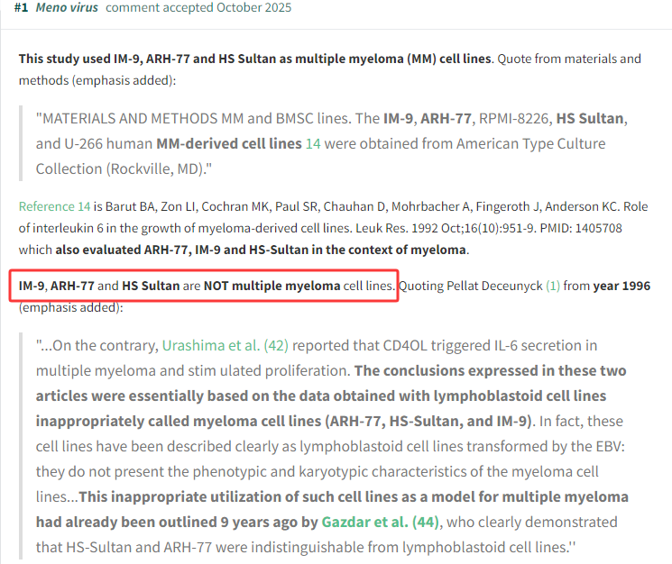 1995年4月,美国的丹娜法伯癌症研究院在Blood.期刊(IF=23.1)发表一篇题为《CD40 ligand triggered interleukin-6 secretion in multiple myeloma》的文章。2025年10月份,Meno virus对该文章所用的IM-9、ARH-77、HS Sultan三株细胞系提出质疑,Meno virus认为这三株细胞系被证实均非多发性骨髓瘤细胞系,相关研究的实验结果、结论已失去可信度。此外,Meno virus引用了Pellat Deceunyck的文献内容来支持自己的观点—“早在九年前,Gazdar等人就已指出,将这些细胞系(IM-9、ARH-77、HS Sultan)用作多发性骨髓瘤的细胞模型存在不当之处”。