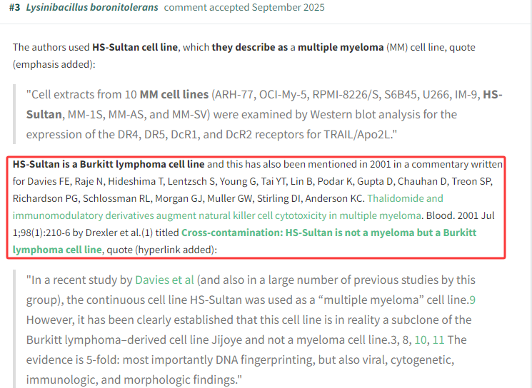 到了2001年8月,K C Anderson团队在Blood.期刊(IF=23.1)再次发表了一篇题为《TRAIL/Apo2L ligand selectively induces apoptosis and overcomes drug resistance in multiple myeloma: therapeutic applications》的文章。该文章依然用了IM-9、ARH-77、HS Sultan这三株问题细胞系。2025年9月,Lysinibacillus boronitolerans在Pubpeer上提出了质疑!