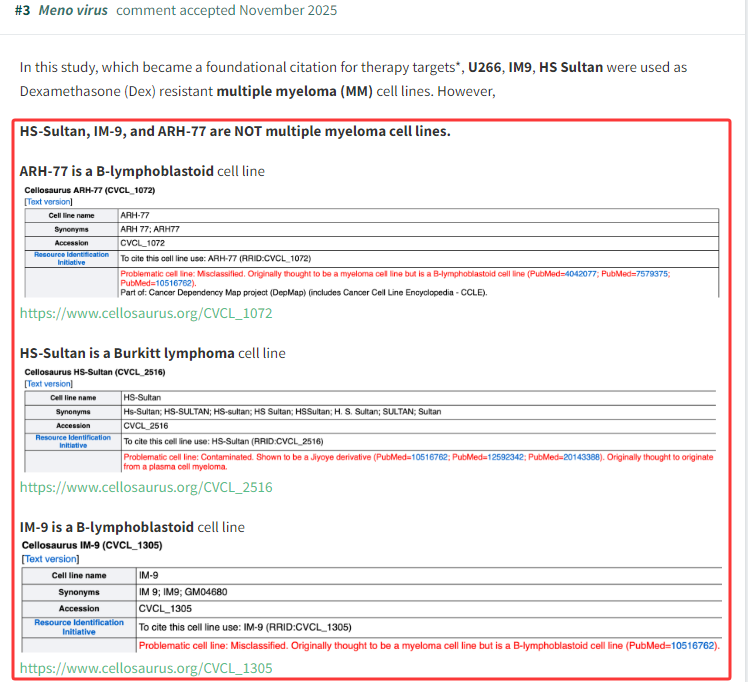 1999年11月,还是美国丹娜法伯癌症研究院的K C Anderson团队在Oncogene.期刊(IF=7.3)发表一篇文章——《RAFTK/PYK2-dependent and -independent apoptosis in multiple myeloma cells》。2025年11月,依然是Meno virus对IM-9、ARH-77、HS Sultan这三株细胞系用于多发性骨髓瘤相关研究提出质疑。这次,Meno virus将IM-9、ARH-77、HS Sultan在cellosaurus数据库的预警信息依次列出。