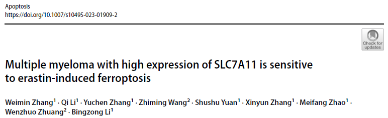 - 多发性骨髓瘤研究新发现 |《Apoptosis》(2025 IF:8.1,JCR Q1)解读:SLC7A11高表达的多发性骨髓瘤对erastin诱导的铁死亡敏感2026-04-03 今天推荐的是由苏州大学附属第二医院等单位,于2024年4月发表于Apoptosis的一篇研究论文。该研究系统揭示了SLC7A11在多发性骨髓瘤(MM)中对erastin诱导铁死亡的敏感性决定作用,全面阐述了SLC7A11表达水平与MM进展及...READ MORE