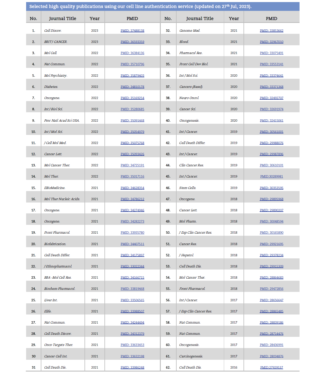 Selected high quality publications using our cell line authentication