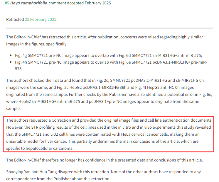 2018年9月,重庆医科大学某附属医院在J Exp Clin Cancer Res.期刊(IF= 12.8)发表一篇题为《Long noncoding RNA MIR31HG inhibits hepatocellular carcinoma proliferation and metastasis by sponging microRNA-575 to modulate ST7L expression》的文章。2024年4月,Hoya camphorifolia在Pubpeer上对该文章提出质疑,其中包括了作者使用的SMMC-7721、L-02细胞系。2025年2月25日,该文章因为实验图片问题以及使用问题细胞系被撤稿,相关撤稿评论写到:“本研究的体外和体内实验所用细胞系的STR分析结果显示,SMMC7721和L-02细胞系均受到了HeLa的污染(具体可参看《SMMC7721:苏州鉴达细胞株鉴定预警系列1》和《L-02 (HL7702):苏州鉴达细胞株鉴定预警系列4》),这两株细胞系都不再适用于肝癌相关研究。这一发现在一定程度上削弱了文章针对肝细胞癌所提出的主要结论的可靠性。”