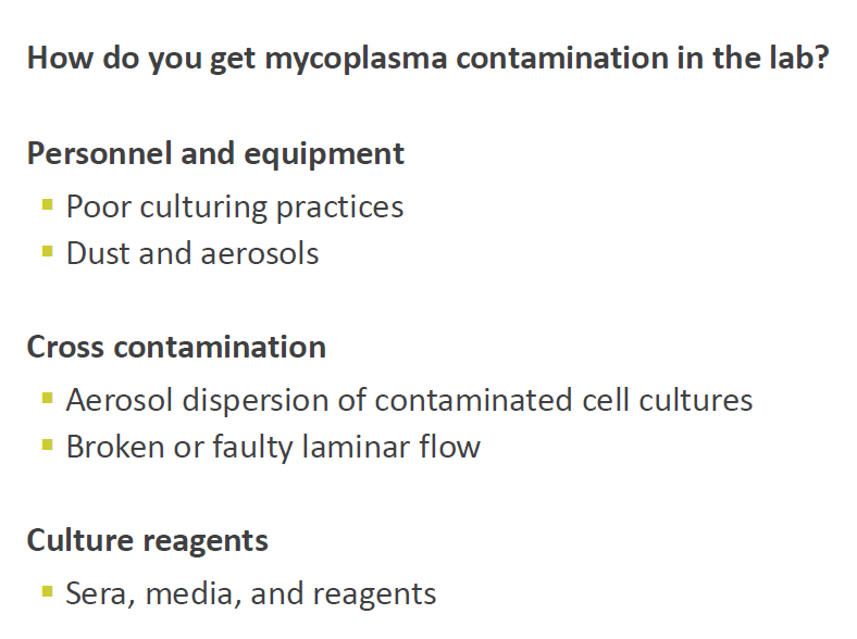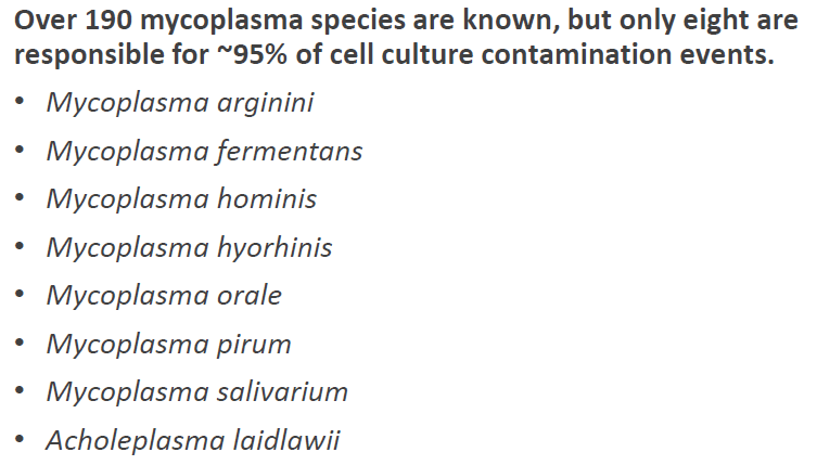 调查发现,大约有190种可知的支原体;其中大约有二十多种支原体能够污染细胞,有的细胞株甚至会被两种以上的支原体同时污染。研究表明,污染细胞的支原体95%以上为以下8种:口腔支原体(M.orale)、精氨酸支原体(M.arginini)、猪鼻支原体(M.hyorhinis)、莱氏无胆甾原体(A.laidlawii)、发酵支原体(M.fermentans)、人型支原体(M.hominis)、唾液支原体(M.salivarium)、梨支原体(M.pirum)。