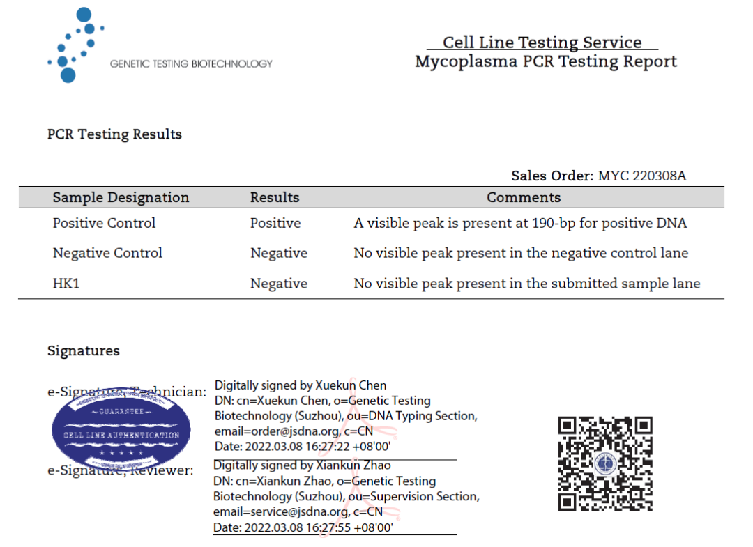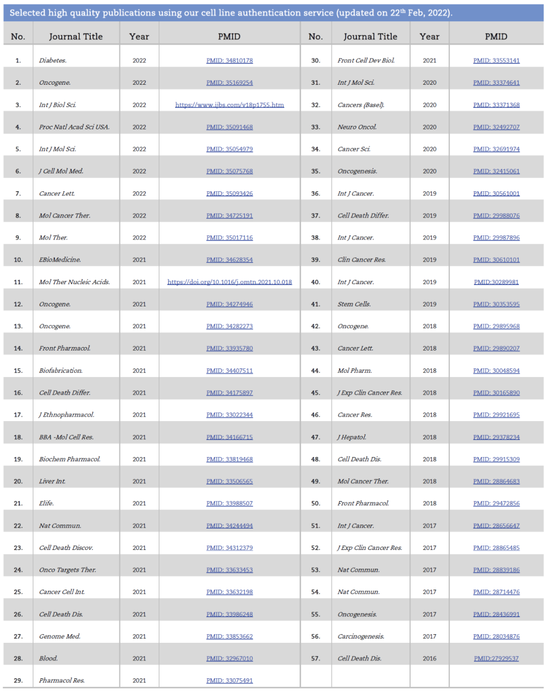 如客户在发表的高水平SCI论文(IF>8)中标注细胞株鉴定由我公司完成,我们承诺为客户免费检测两株细胞株。格式如下:The cell lines were characterized by Genetic Testing Biotechnology Corporation (Suzhou,China) using short tandem repeat (STR) markers.